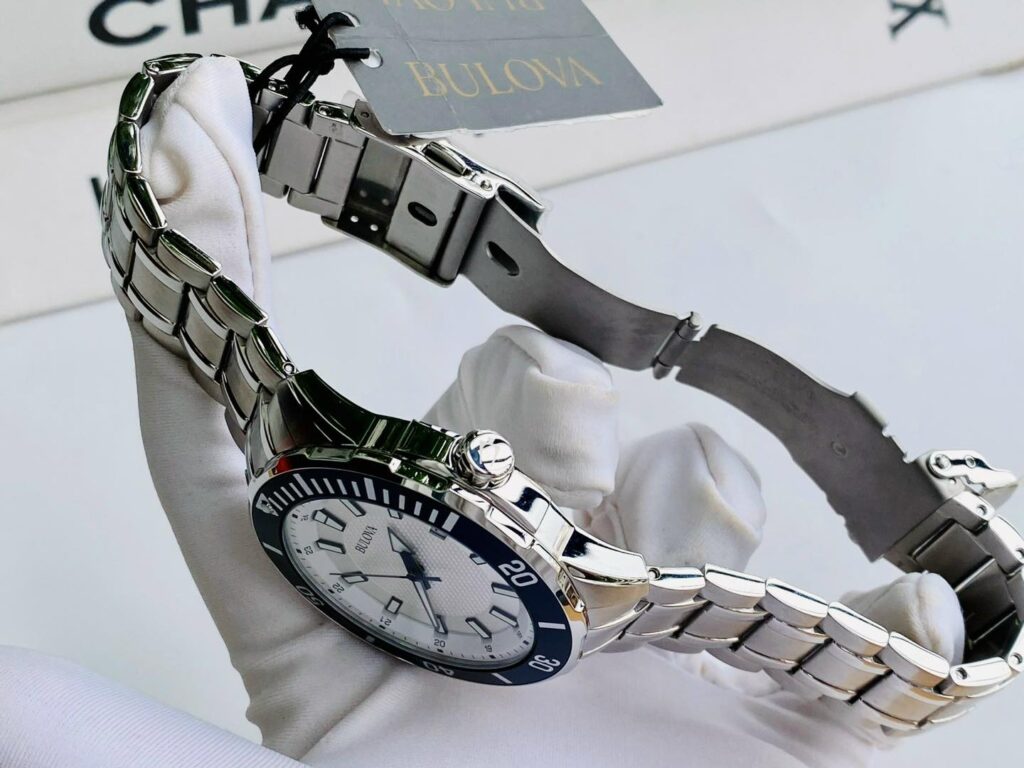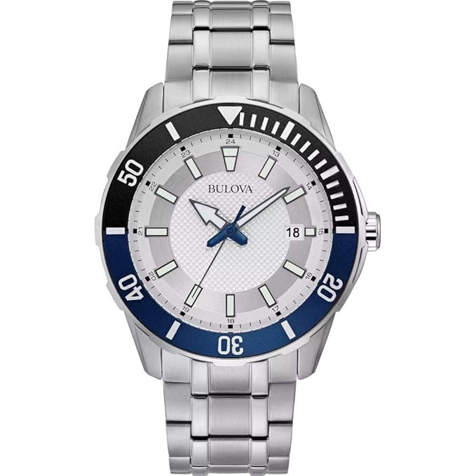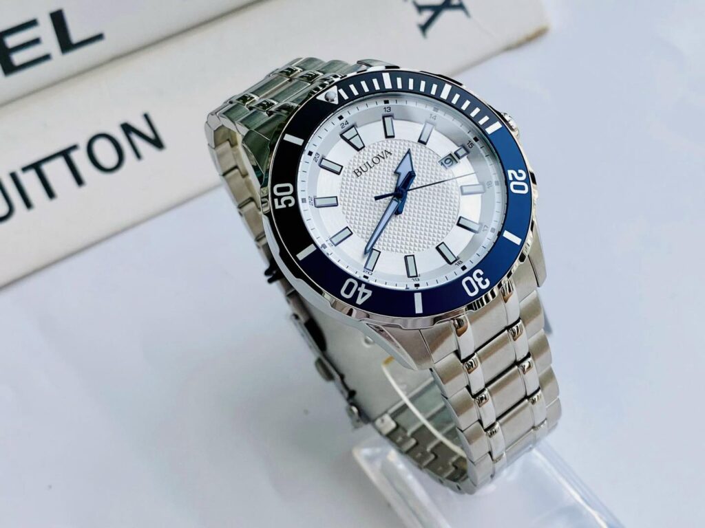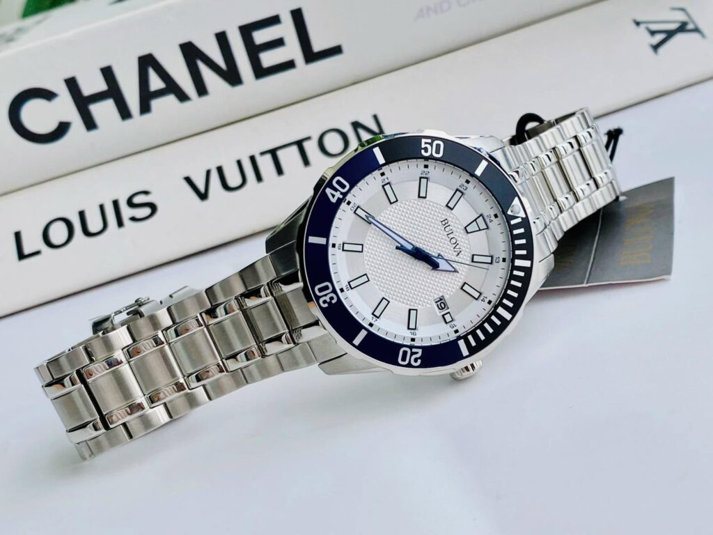 Đồng hồ Bulova Nam Chính Hãng 98B349 Quartz Date Indicator Silver-Tone Blue Bezel Men’s Watch