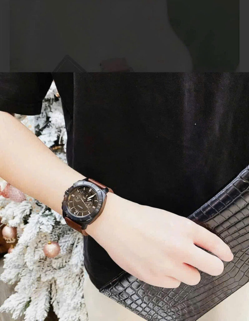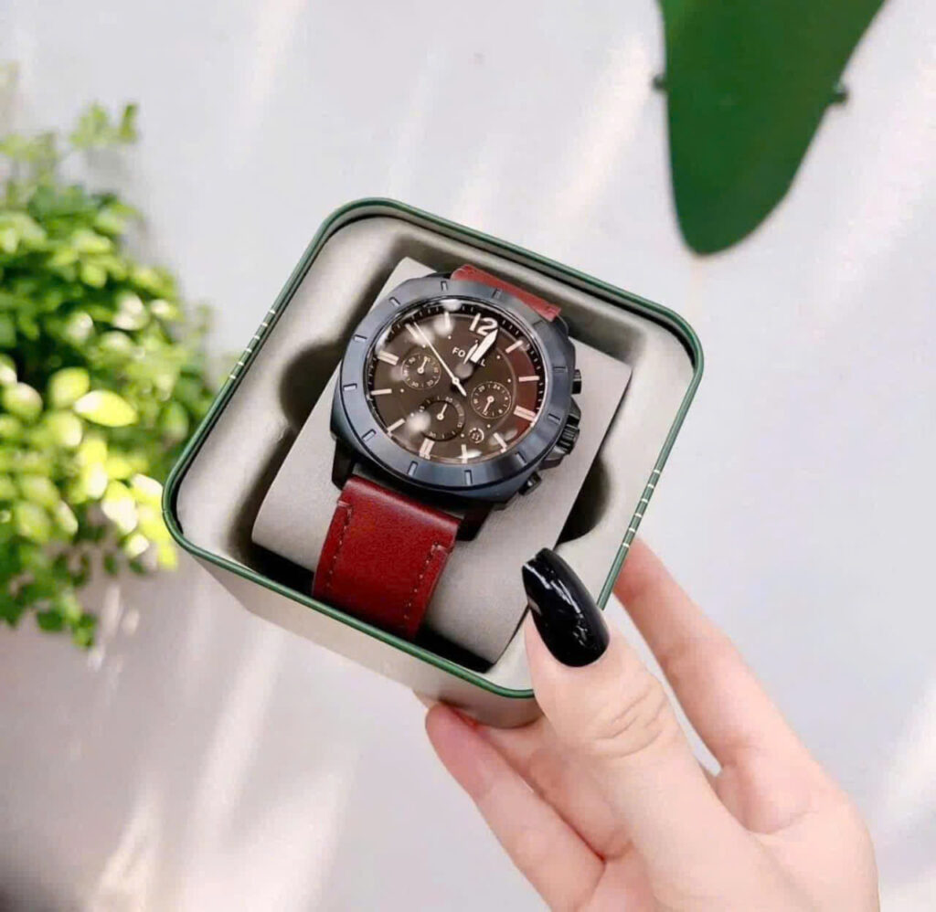 Đồng hồ nam Fossil FS5120 là sự kết hợp hoàn hảo giữa phong cách thể thao và vẻ ngoài sang trọng. Với kích thước mặt số lớn 45mm và độ dày 13mm, chiếc đồng hồ mang đến cảm giác mạnh mẽ, nam tính cho cổ tay. Mặt số màu đen lịch lãm nổi bật với viền vàng hồng thời thượng, tạo điểm nhấn sang trọng và đẳng cấp. Đồng hồ được trang bị chức năng chronograph (đếm giờ thể thao) tiện lợi, phù hợp cho các hoạt động vận động và thể thao hàng ngày. Dây da màu đen mềm mại, ôm sát cổ tay, mang lại sự thoải mái khi đeo lâu dài. Fossil FS5120 là lựa chọn lý tưởng cho quý ông yêu thích phong cách hiện đại pha chút cổ điển đầy cuốn hút.
