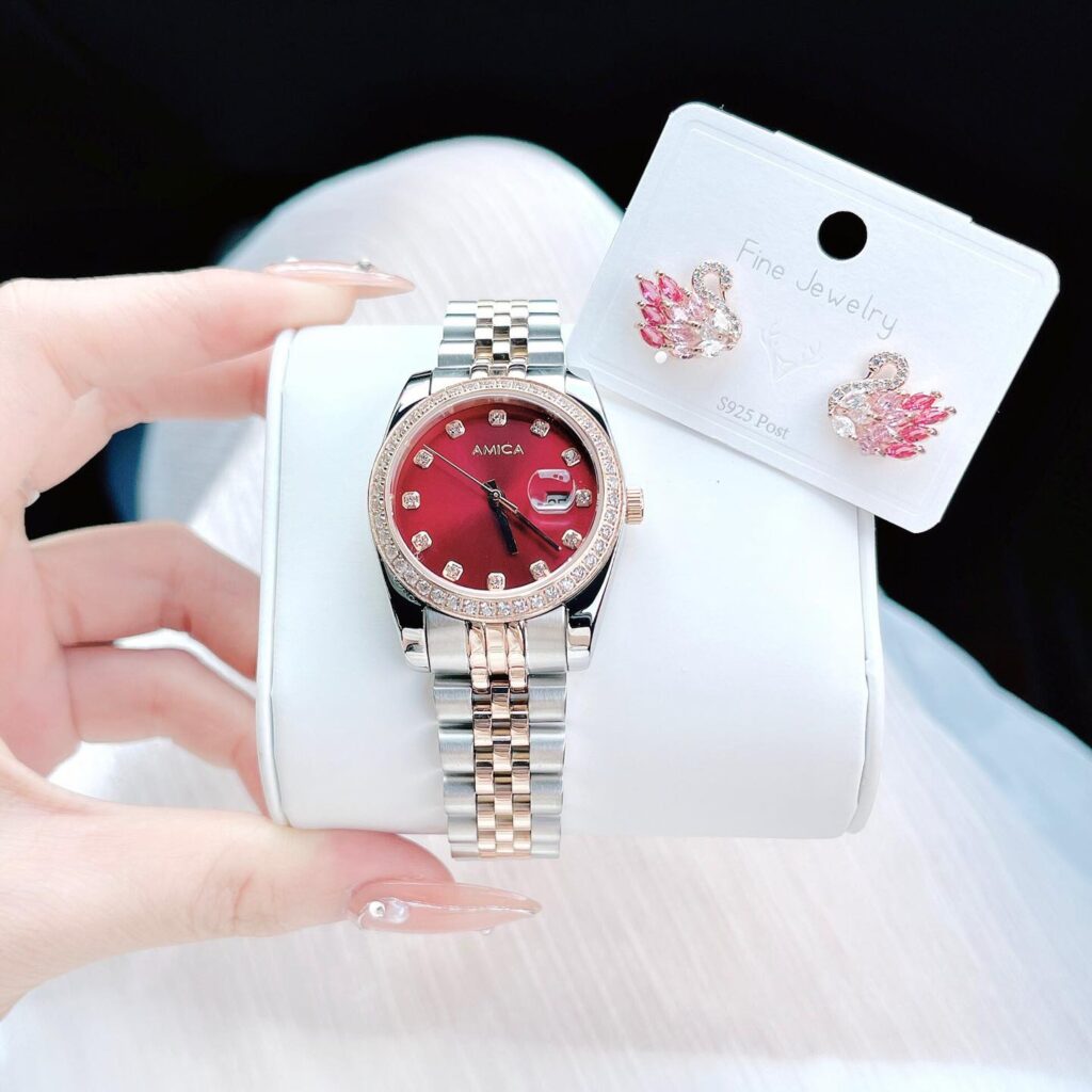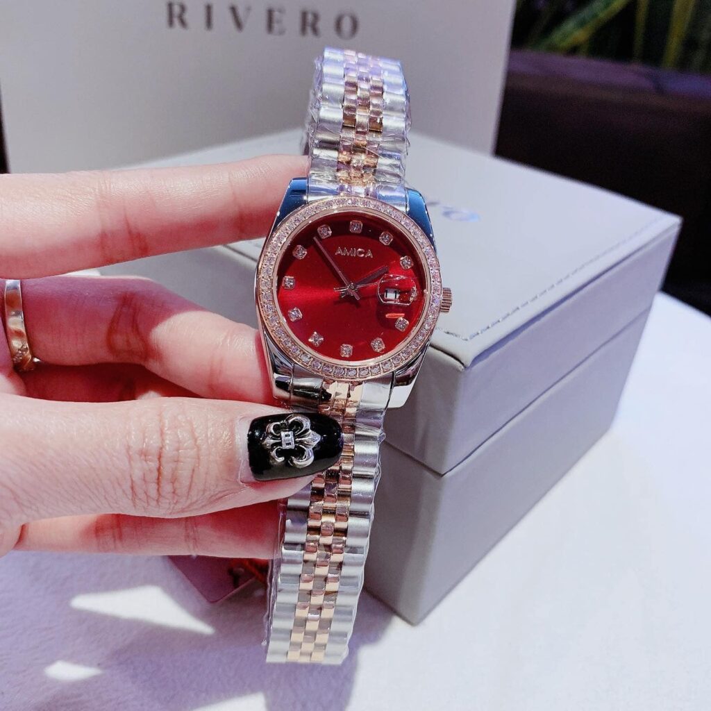 Đồng Hồ Amica Chính Hãng Nữ Red Dial Pave Ladies Watch