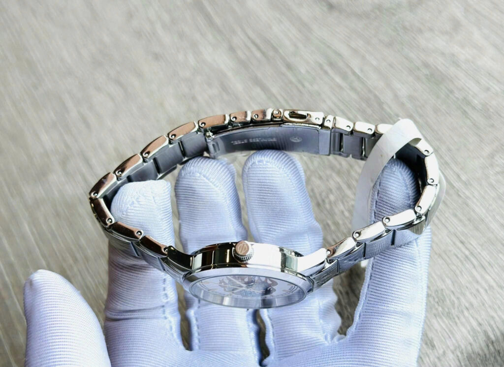 - Chỉ bảo hành thay thế mới cho những linh kiện, phụ tùng bị hỏng do lỗi của nhà sản xuất – không thay thế bằng một chiếc đồng hồ khác.Những đồng hồ có biểu hiện chạy sai giờ (nhanh hoặc chậm hơn), đứng máy và các lỗi khác thuộc về chức năng của bộ máy đồng hồ sẽ được áp dụng chế độ bảo hành của chúng tôi. Chế độ bảo hành của chúng tôi KHÔNG BAO GỒM các hư hại bên ngoài của đồng hồ.
