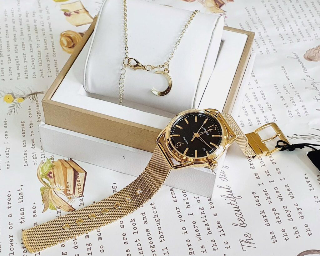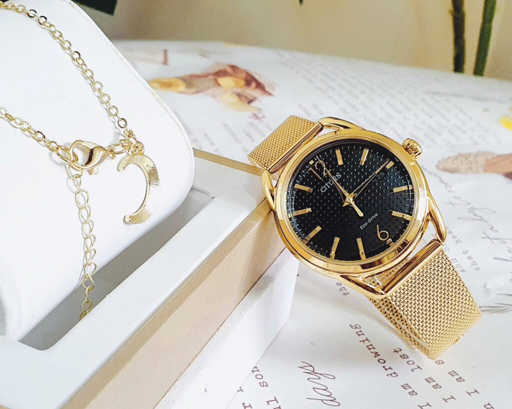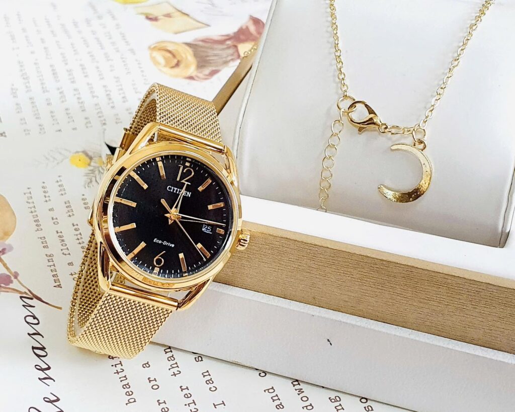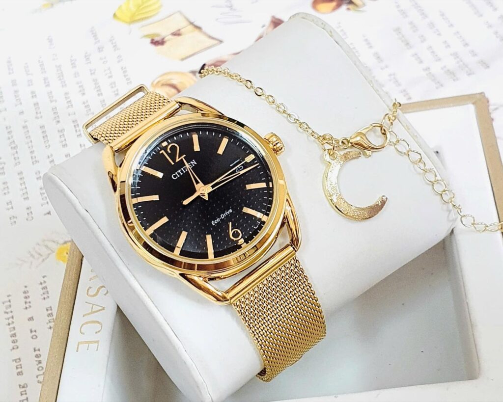 Đồng Hồ Citizen Nữ Chính Hãng FE6082-59E Black Dial Gold-tone Mesh Ladies Watch
