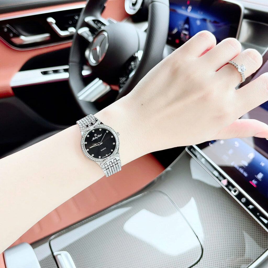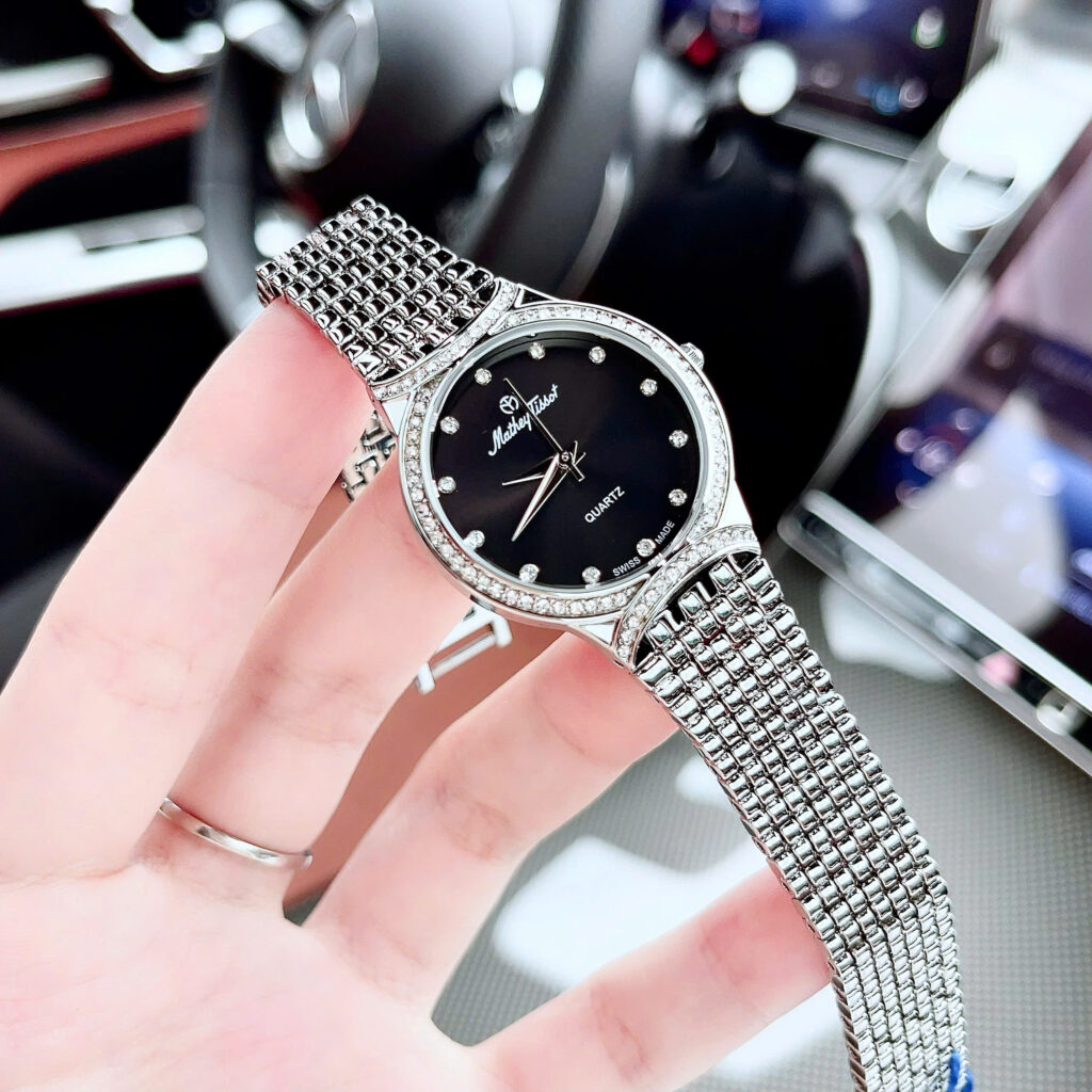 Đồng hồ nữ Mathey-Tissot D2681AN – Tinh tế và đẳng cấp từ Thụy Sỹ Mathey-Tissot D2681AN là mẫu đồng hồ nữ cao cấp đến từ Thụy Sỹ, nổi bật với thiết kế sang trọng và thanh lịch, phù hợp cho những quý cô yêu thích vẻ đẹp cổ điển pha lẫn nét hiện đại. Sản phẩm sở hữu mặt số tròn kích thước 28mm – nhỏ gọn và thanh thoát, lý tưởng cho cổ tay nữ giới. Mặt số màu đen nổi bật trên nền dây kim loại màu bạc, tạo nên sự tương phản tinh tế và cuốn hút. Viền mặt được đính hạt lấp lánh, tăng thêm vẻ sang trọng và nữ tính cho tổng thể thiết kế. Dây đeo được chế tác từ thép không gỉ màu bạc, vừa bền bỉ theo thời gian, vừa mang lại cảm giác nhẹ nhàng và thoải mái khi sử dụng. Đồng hồ vận hành bằng máy quartz (chạy pin) chất lượng cao – đặc trưng của đồng hồ Thụy Sỹ – đảm bảo độ chính xác và độ bền vượt trội. Mathey-Tissot D2681AN là lựa chọn lý tưởng cho những dịp trang trọng như tiệc tối, sự kiện hoặc đi làm hằng ngày. Đồng thời, đây cũng là món quà tinh tế dành tặng người phụ nữ bạn yêu thương – thể hiện sự trân trọng và gu thẩm mỹ tinh tế.